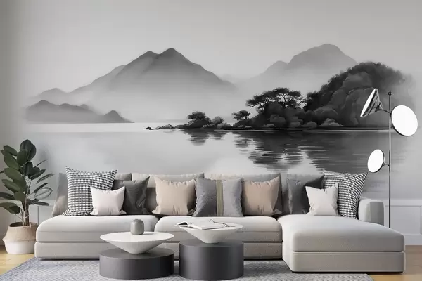 Фотошпалери Чорно-білий пейзаж із горами та озером у легкому тумані w09803