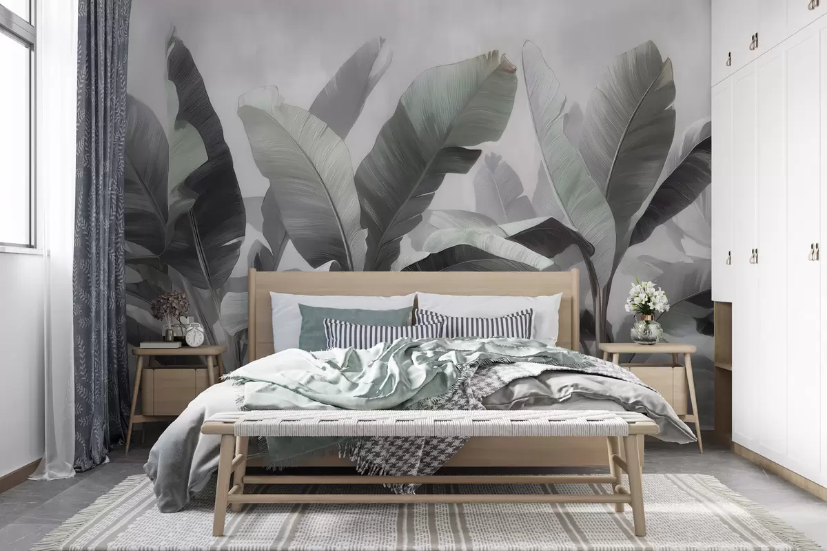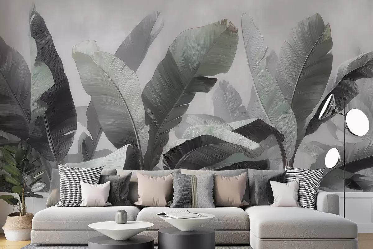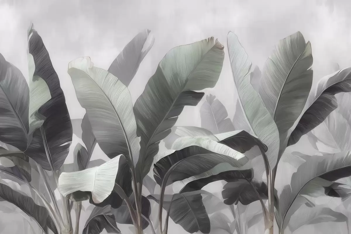Фотошпалери Абстрактні зображення великих тропічних бананових листів у нейтральній кольоровій гамі з м'якими сіро-зеленими відтінками w09805
