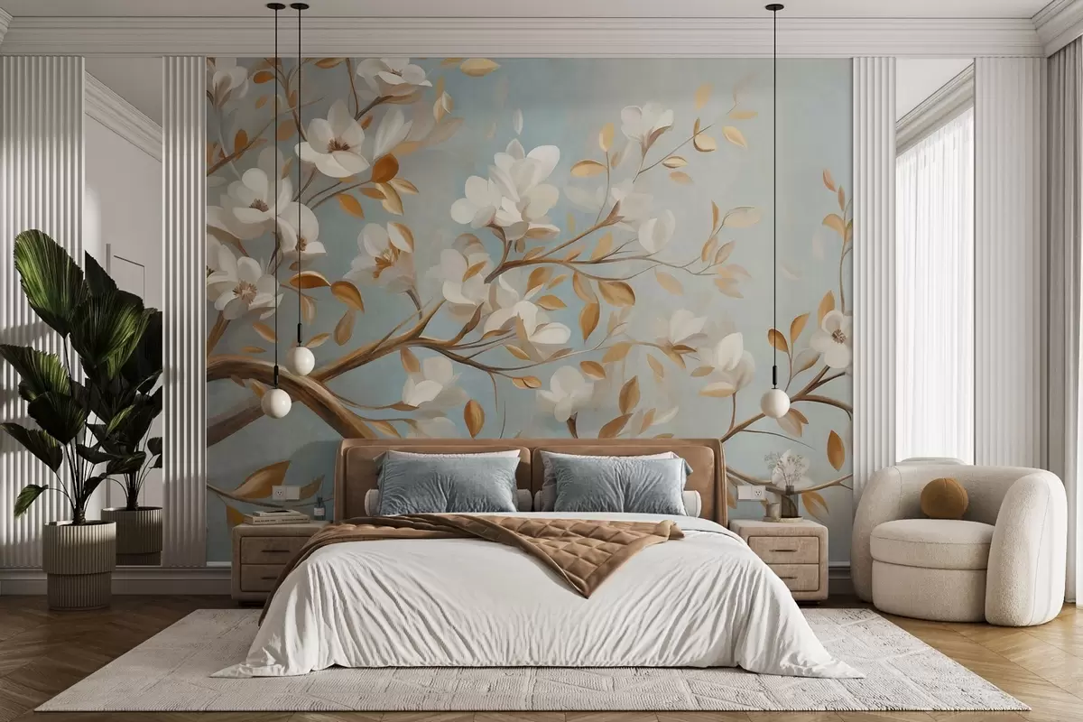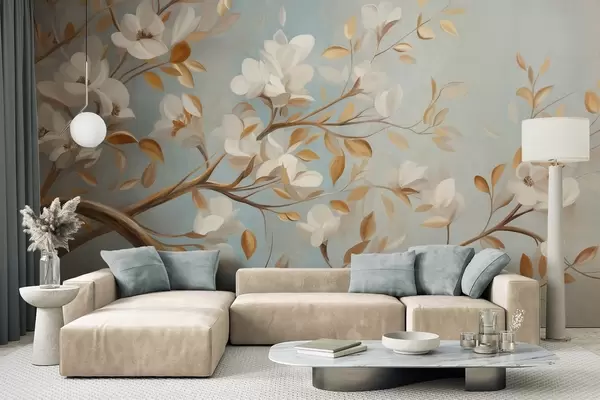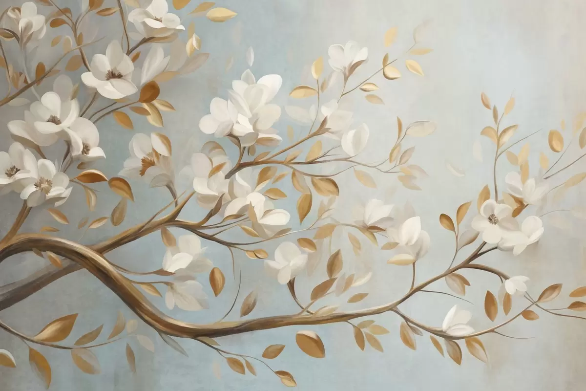 Фотошпалери Текстурована гілка дерева з білими квітами та жовтим листям, у вінтажному стилі w09814