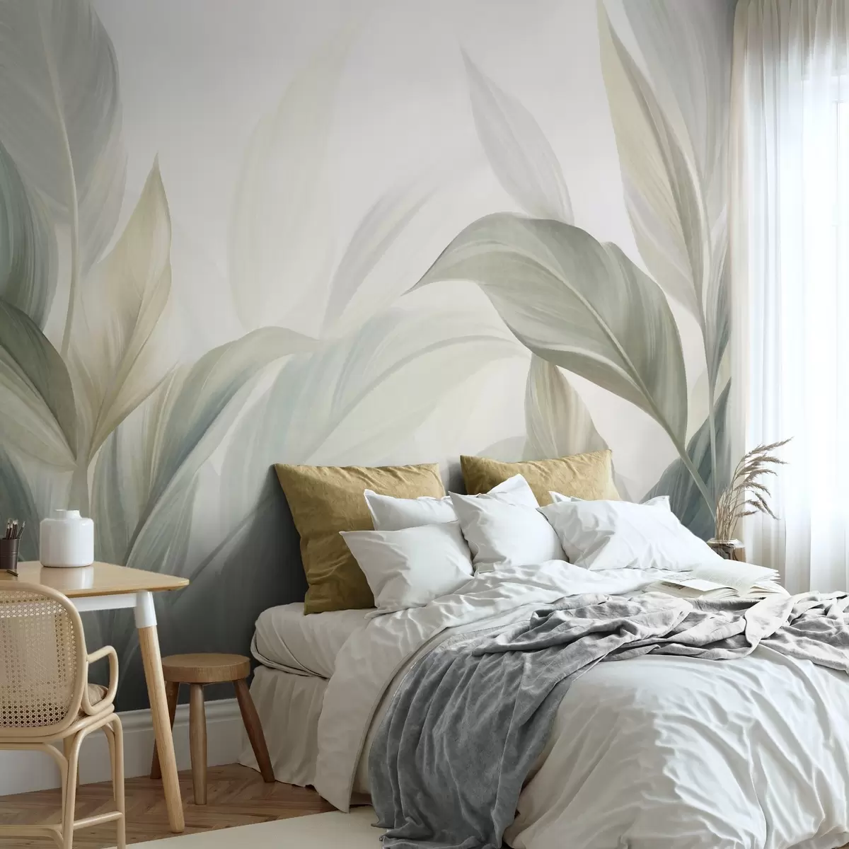 Фотошпалери Велике тропічне листя блідо-зеленого кольору з ніжними пастельними відтінками та фактурним малюнком w09816
