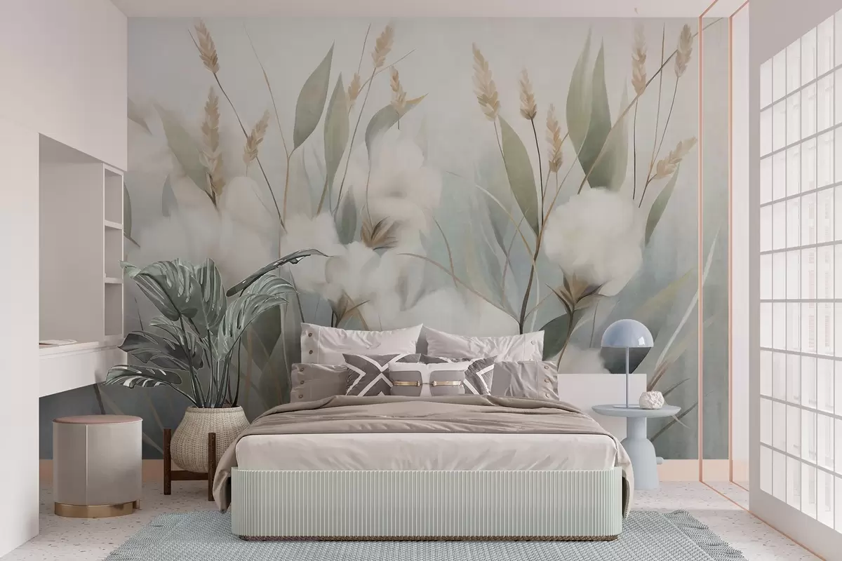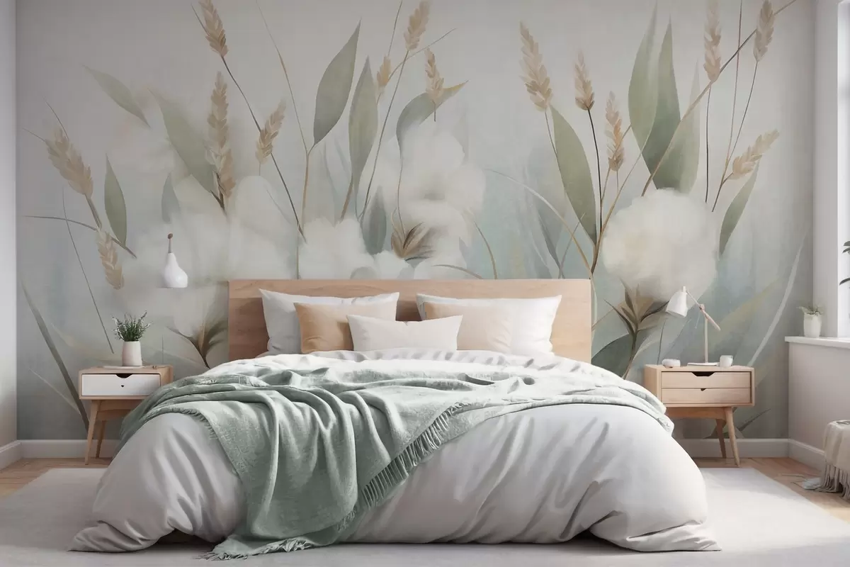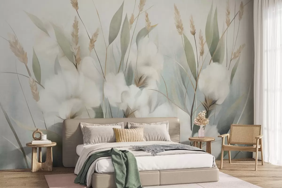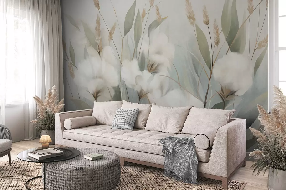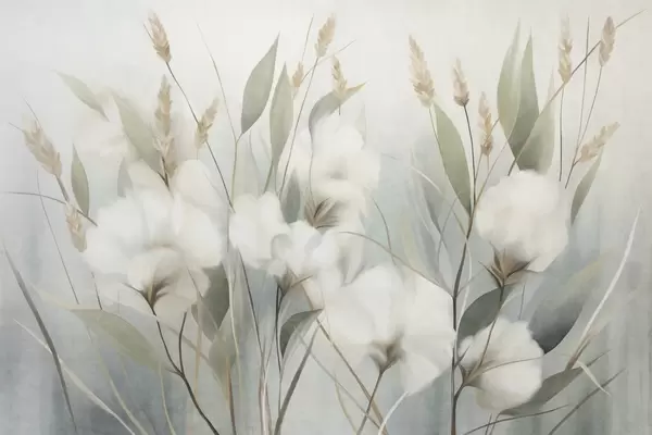 Фотошпалери Білі сухі квіти та висока трава на м'якому, приглушеному тлі, написані в імпресіоністичному стилі w09823