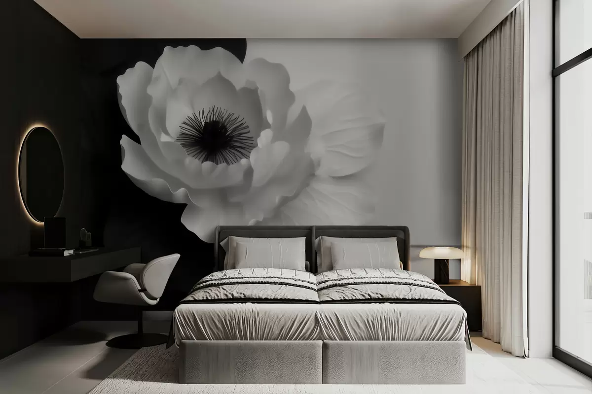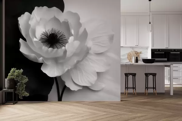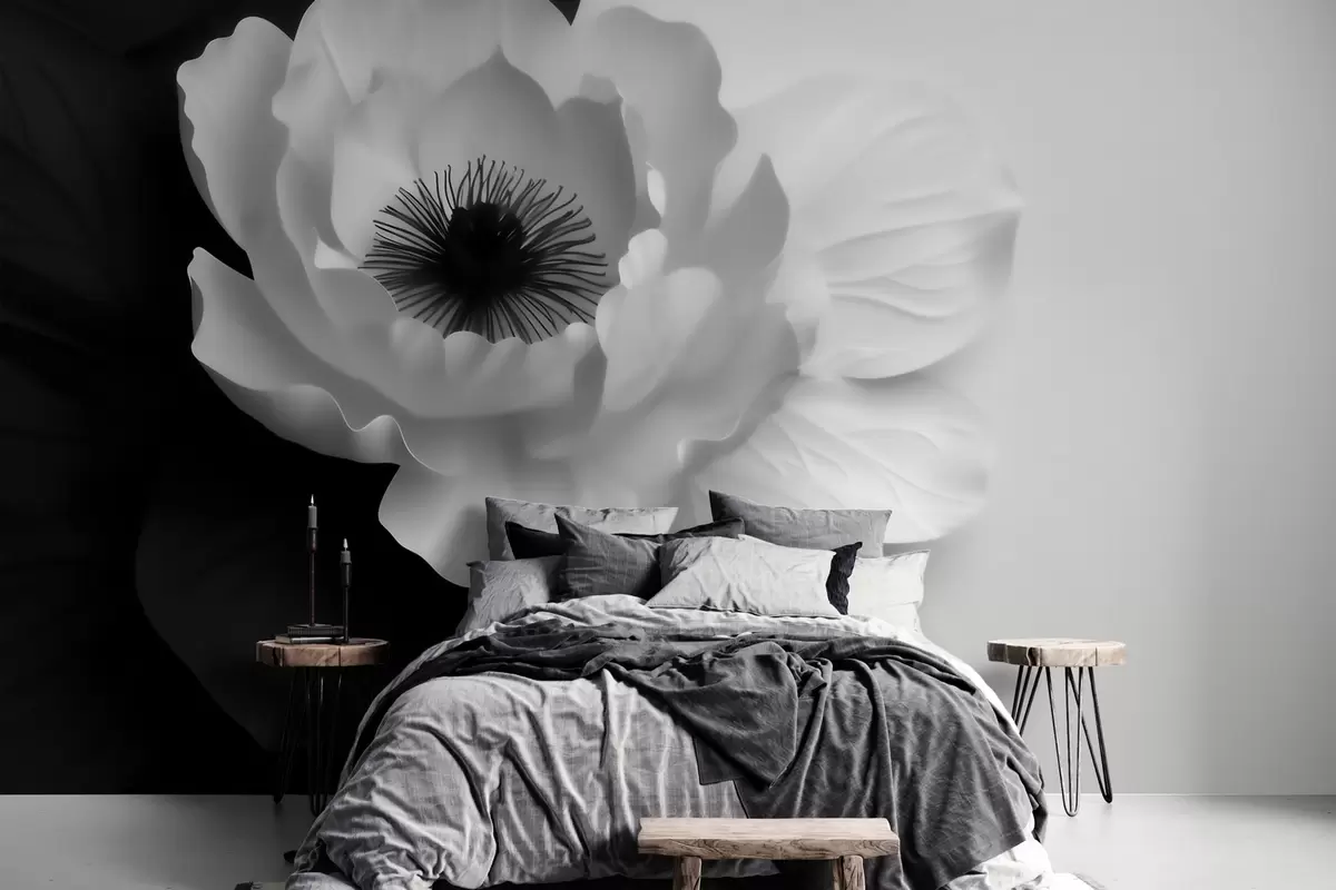 Фотошпалери Контрастна біла квітка з темною серединкою на чорно-білому тлі w09852
