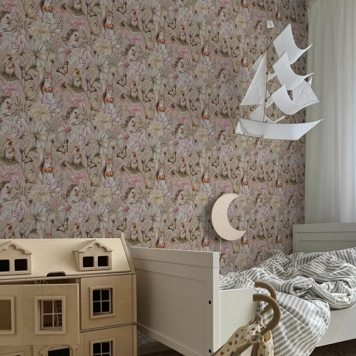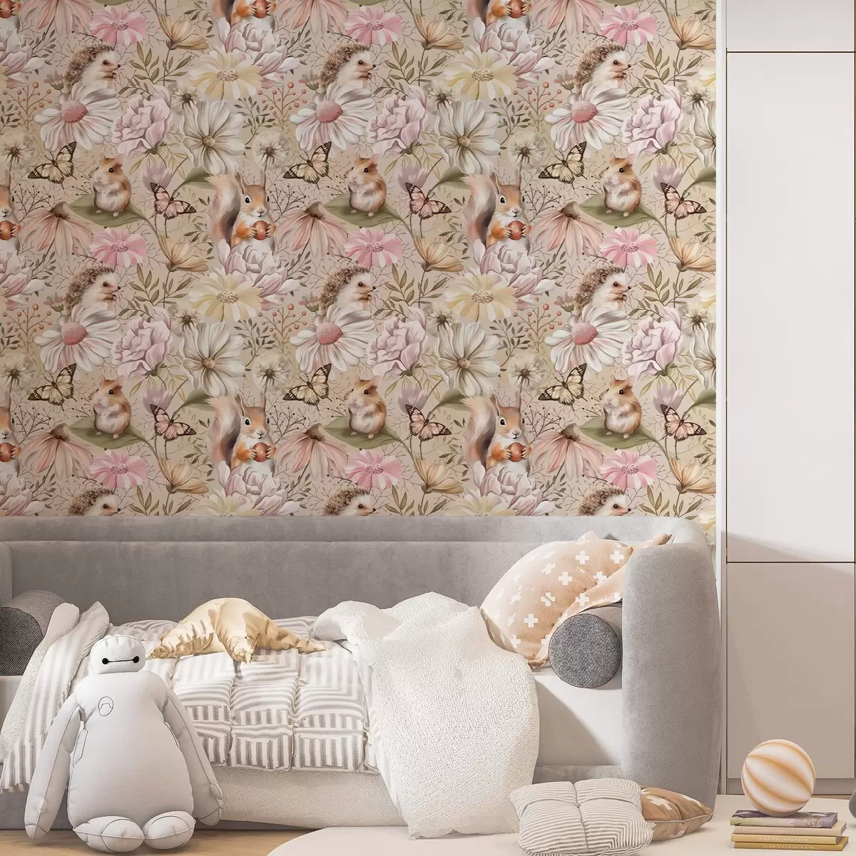 Шпалери Милі їжачок, білочка, хом'ячок і метелики з квітами в пастельних тонах Nr. a00051