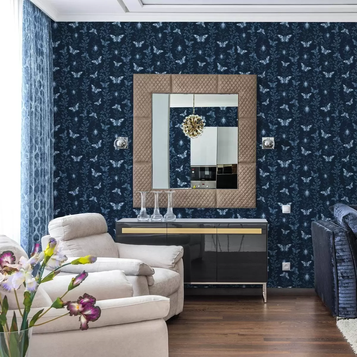 Шпалери Композиція з метеликами, листям і комахами на синьому тлі Nr. a00073