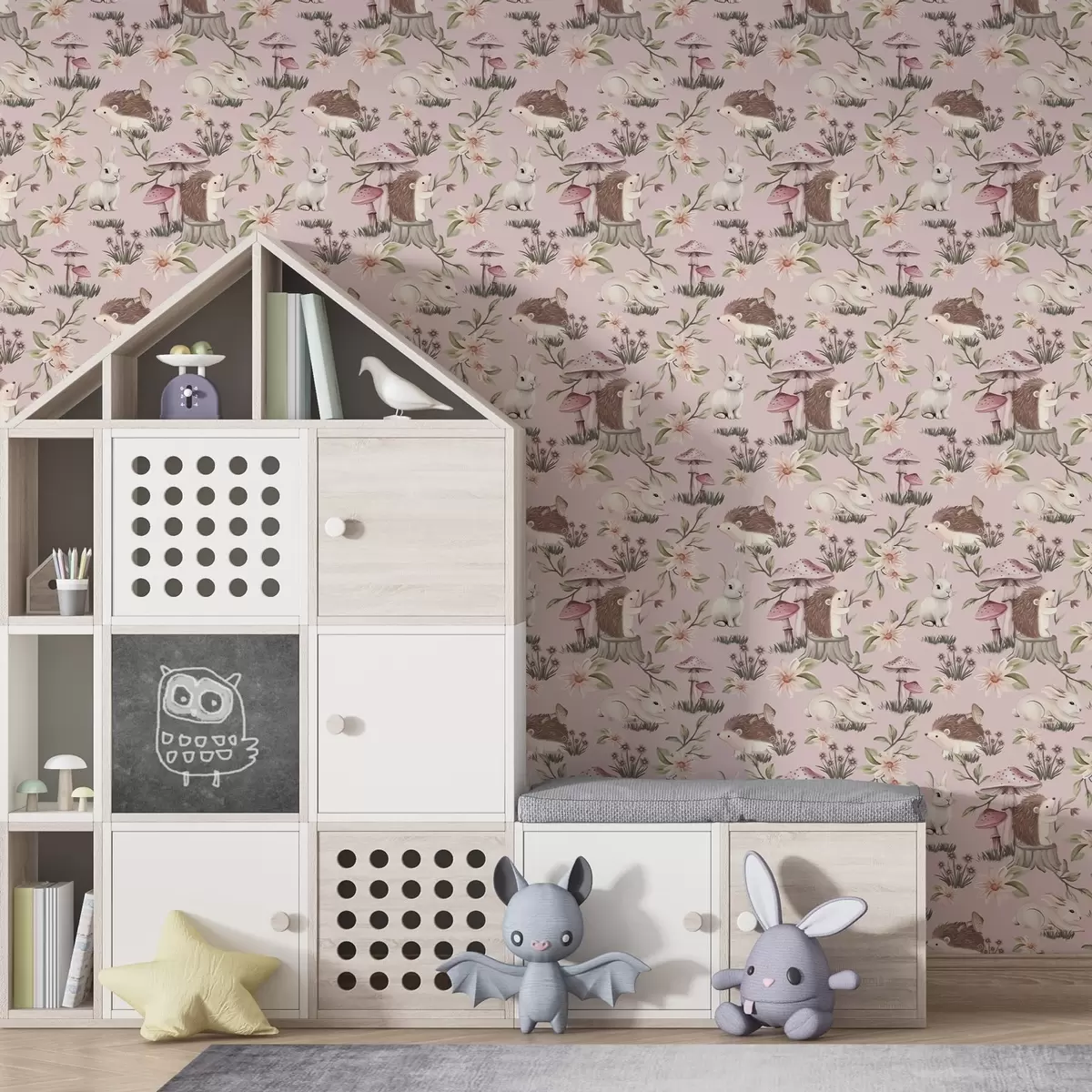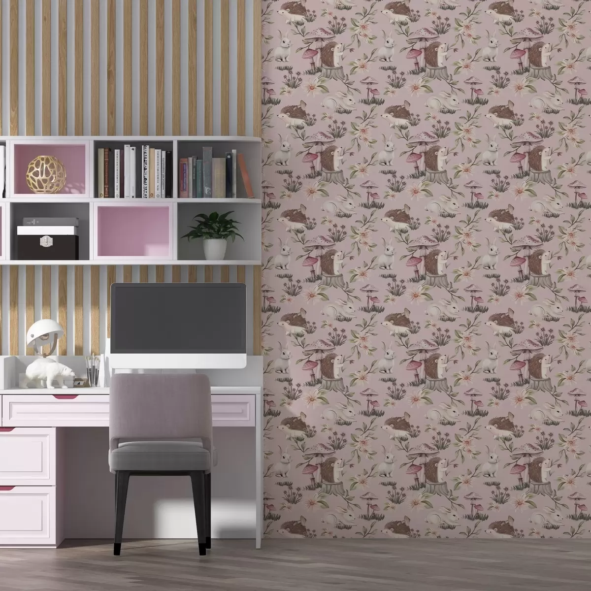 Шпалери Казкові їжачки, кролики та квіти серед грибів на рожевому тлі Nr. a00111