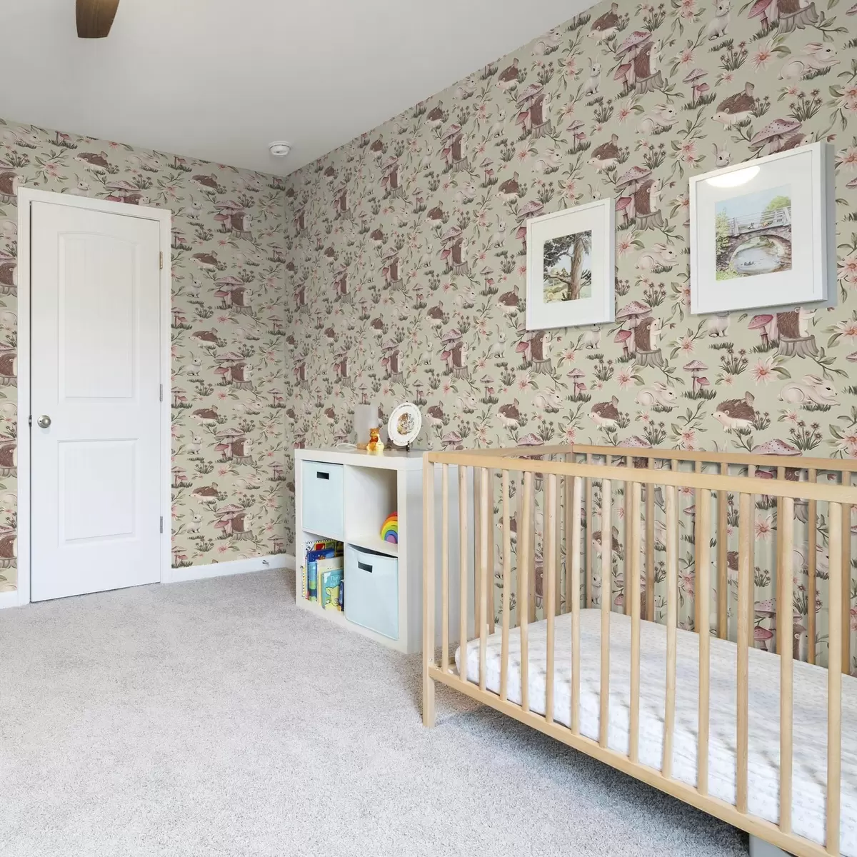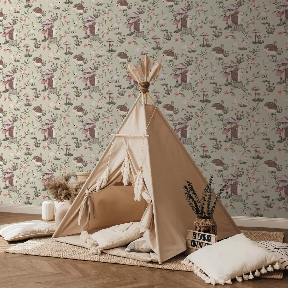 Шпалери Казкові тварини та квіти на зеленому тлі в ніжних пастельних тонах Nr. a00111v1