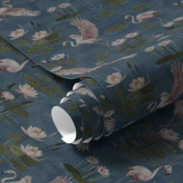 Шпалери Фламінго серед латаття, тропічна сцена на темно-синьому тлі Nr. a00237