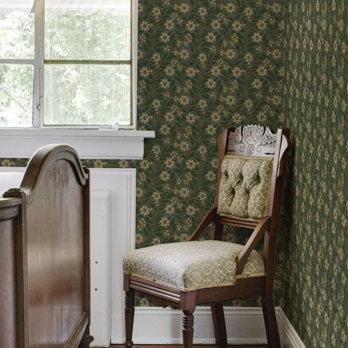 Шпалери Жовті квіти та ягоди на зеленому тлі Nr. a00242