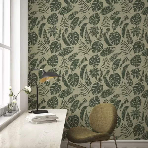 Шпалери Тропічне листя в стилі ліногравюри, зелене на жовтому Nr. a00274