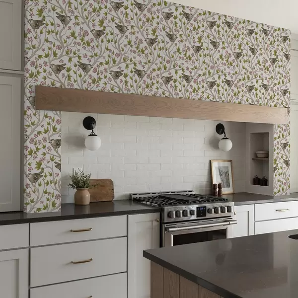 Шпалери Птахи на гілках з листям і ягодами на білому тлі Nr. a00283