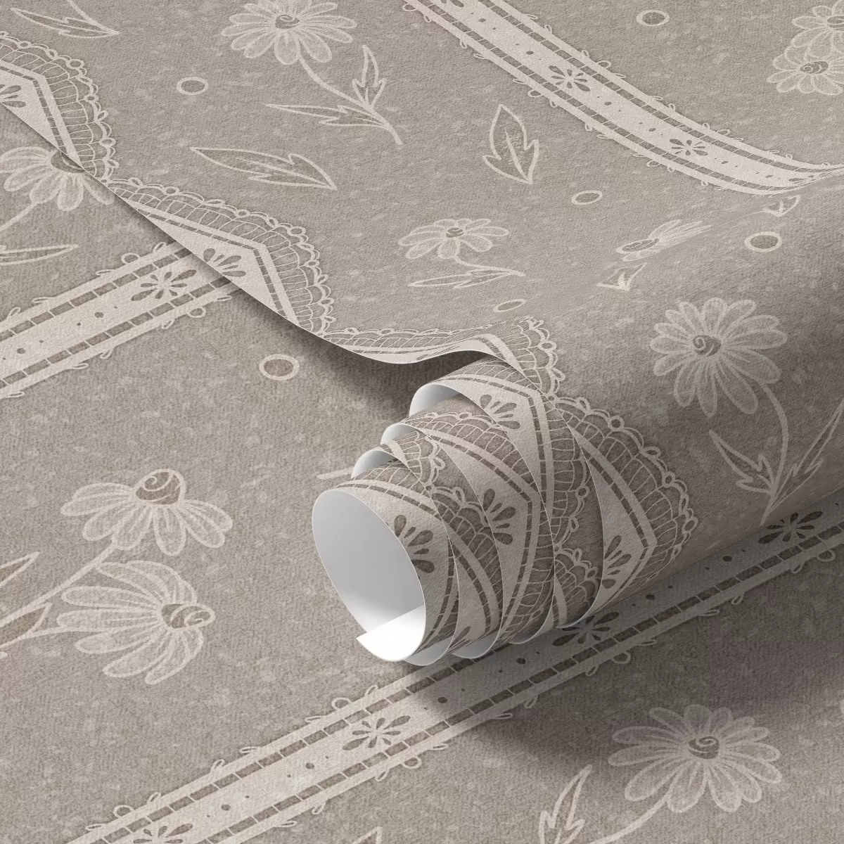 Шпалери Смужки з ромашками та мереживом на сіро-бежевому тлі Nr. a00295
