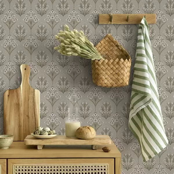 Шпалери Симетричний візерунок з білими квітами на сірому тлі Nr. a00302