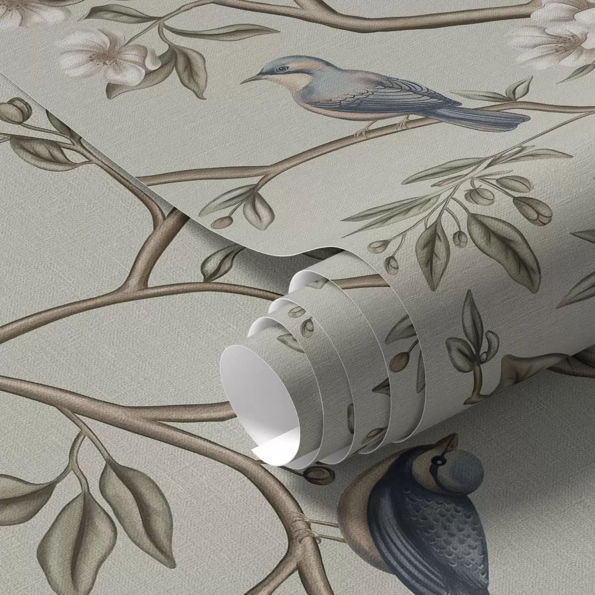 Шпалери Гілки з птахами та білими квітами на ніжному тлі Nr. a00303