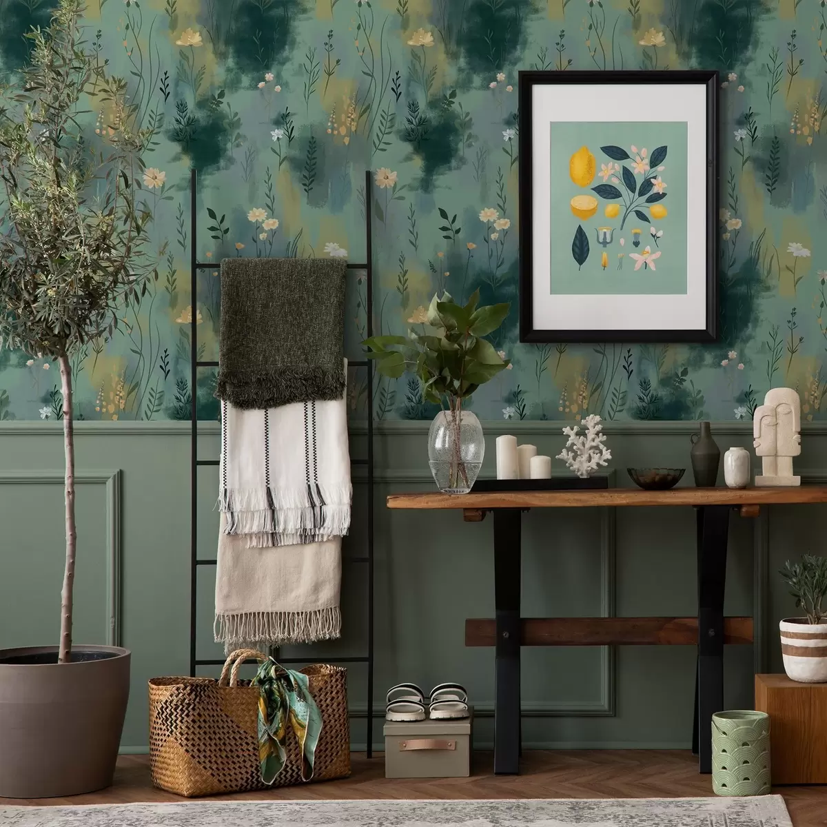 Шпалери Акварельна абстракція з квітами на зеленому тлі Nr. a00312