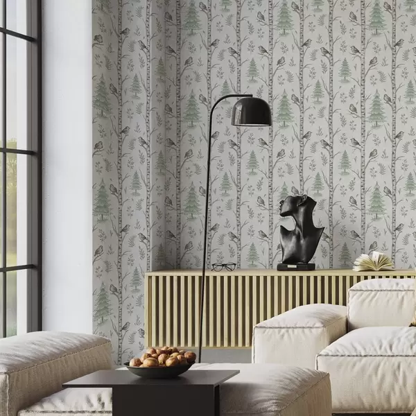 Шпалери Берези з птахами у світло-зеленому лісі Nr. a00316