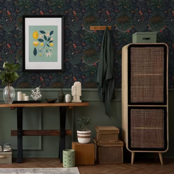 Шпалери Тропічні джунглі з леопардом, леопардом, папугами та метеликами Nr. a00388