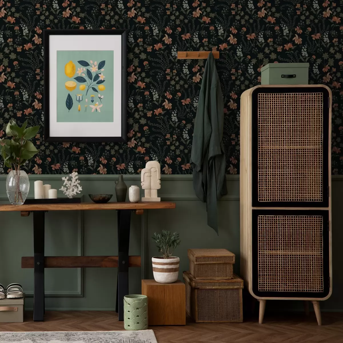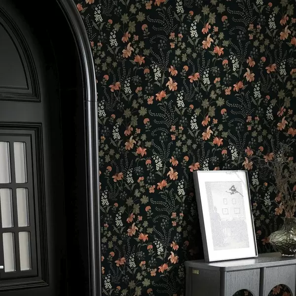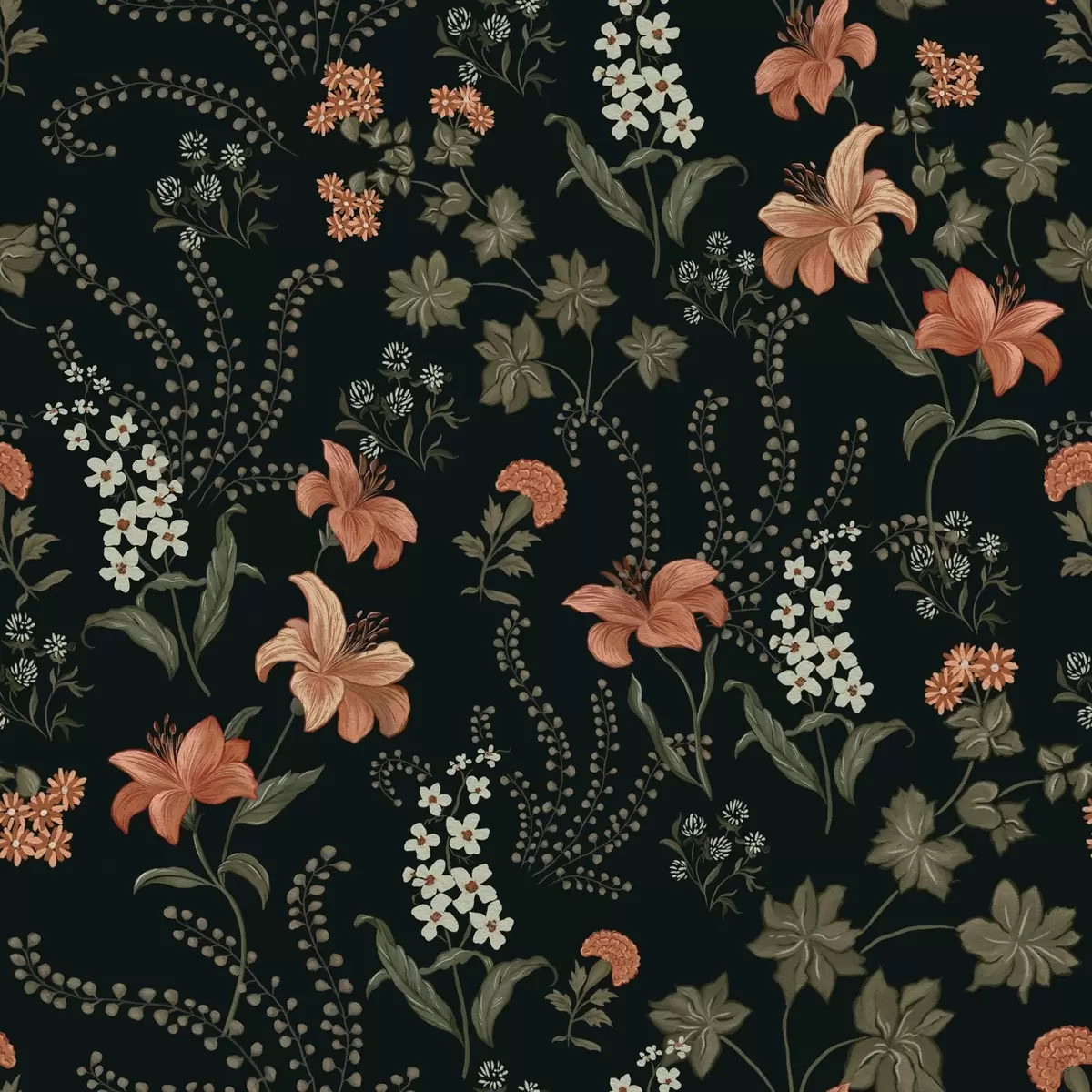 Шпалери Помаранчеві лілії та дрібні квіти на чорному тлі Nr. a00463