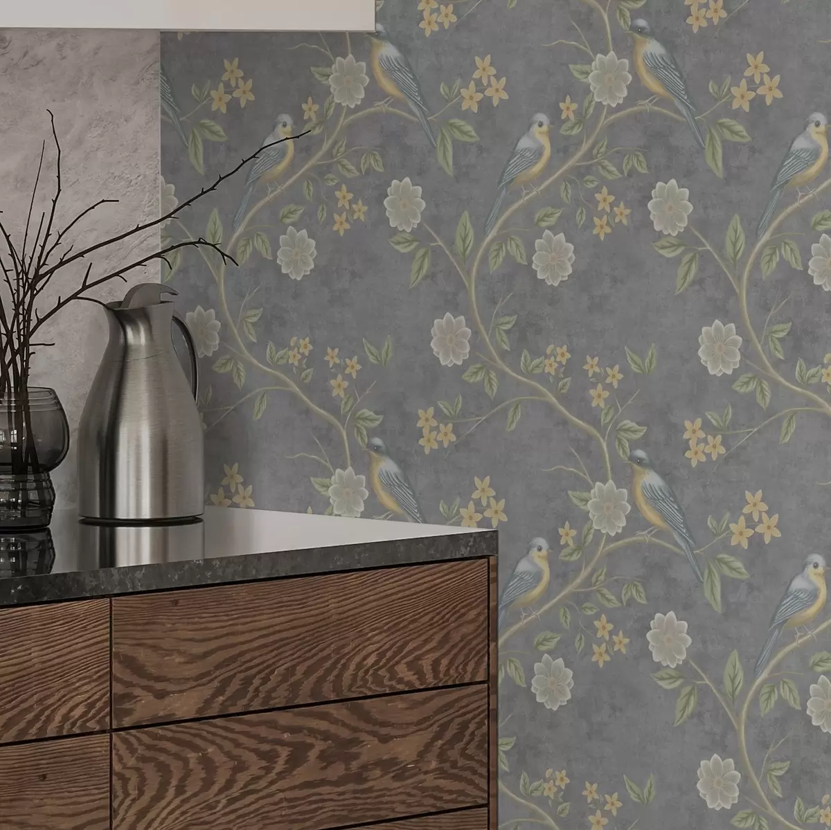 Шпалери Птахи на гілках серед квітів на сірому тлі Nr. a00483