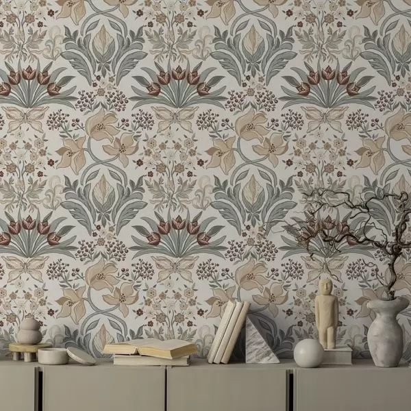 Шпалери Декоративні лілії та метелик на кремовому тлі Nr. a00500