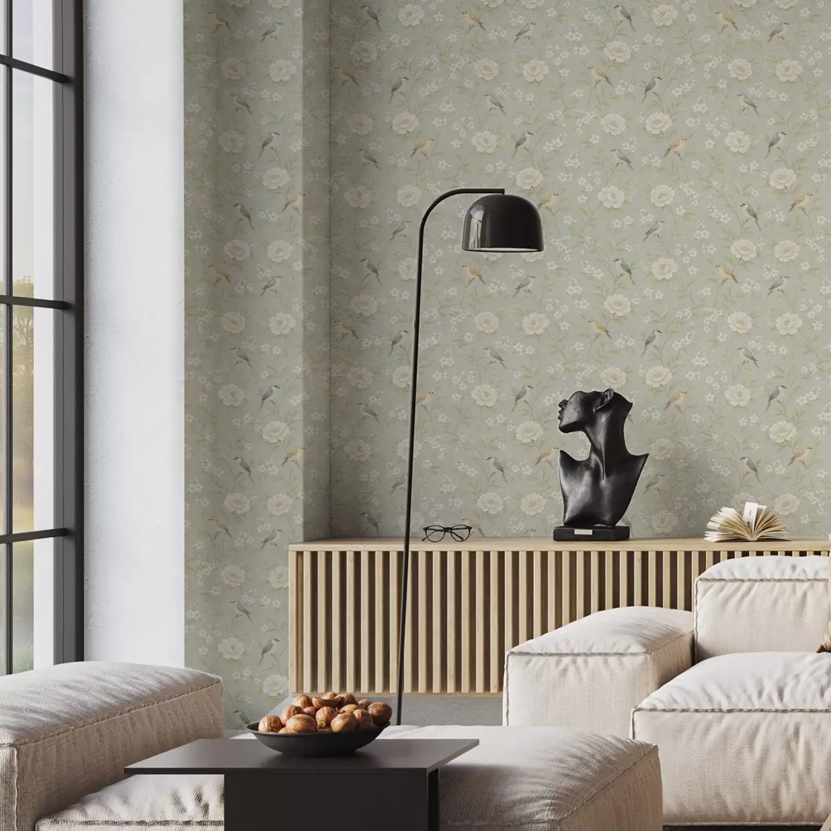 Шпалери Птахи серед білих квітів на сіро-зеленому тлі Nr. a00583