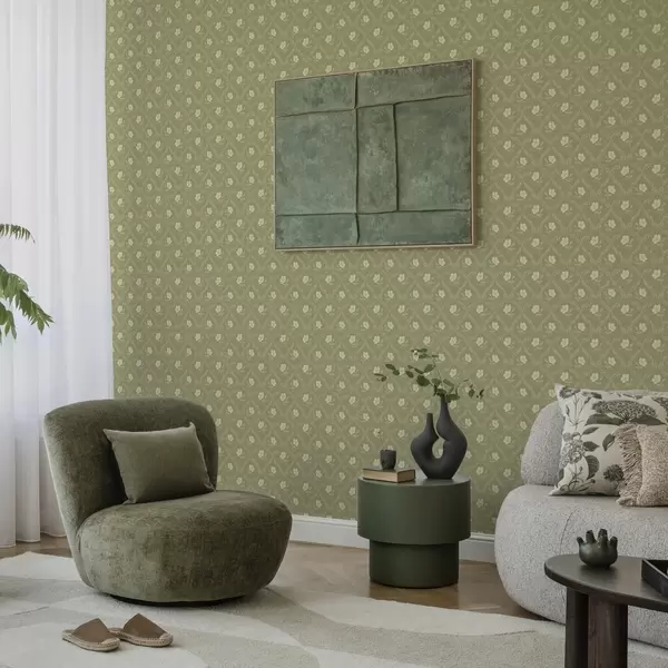 Шпалери Оливкова шпалера з кремовими квітами, ретро-орнамент a00585