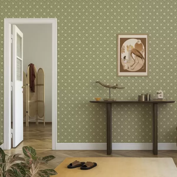 Шпалери Оливкова шпалера з кремовими квітами, ретро-орнамент Nr. a00585