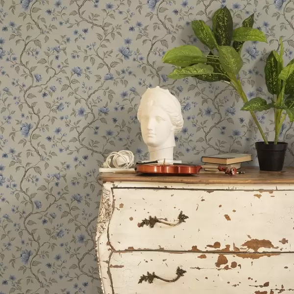 Шпалери Блакитні квітучі гілки на бежевому фоні з льону Nr. a00590