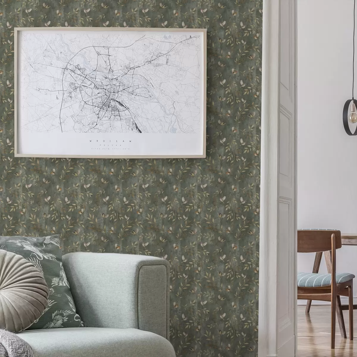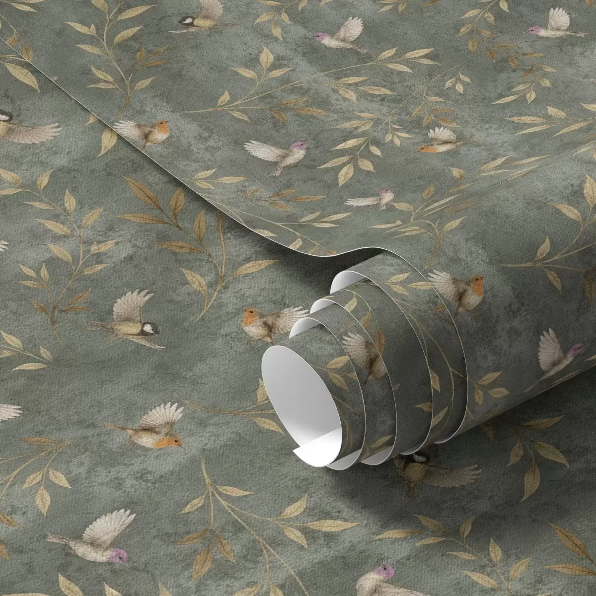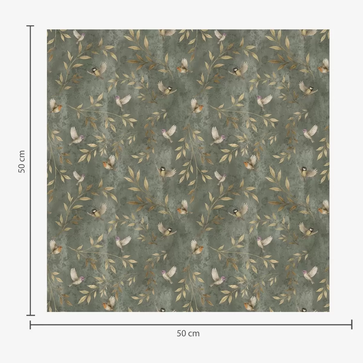 Шпалери Птахи в помаранчевому листі на темно-зеленому тлі Nr. a00591