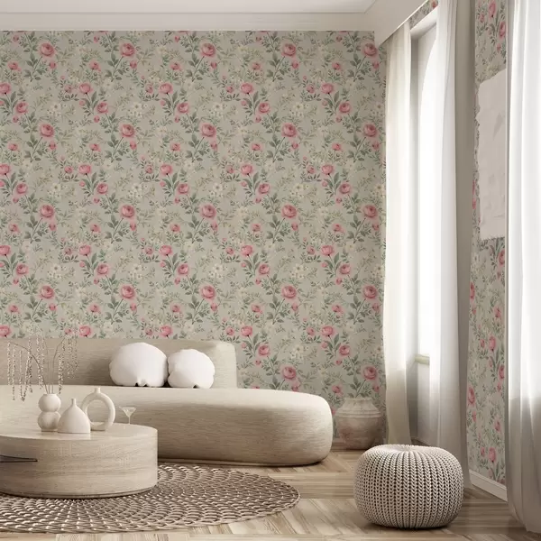 Шпалери Акварельні півонії та білі квіти на сіро-бежевому тлі Nr. a00592