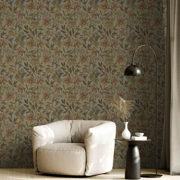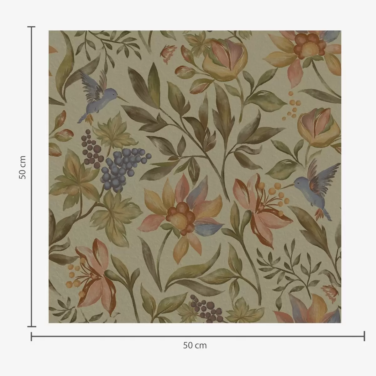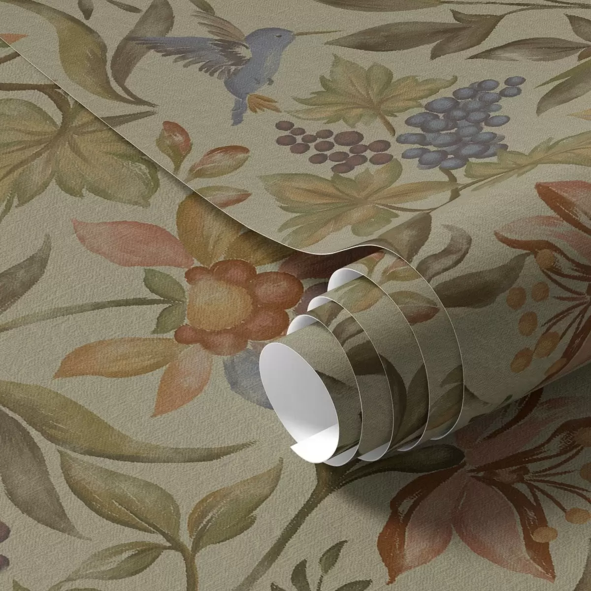 Шпалери Вінтажні квіти та птахи з виноградом на оливковому тлі Nr. a00594