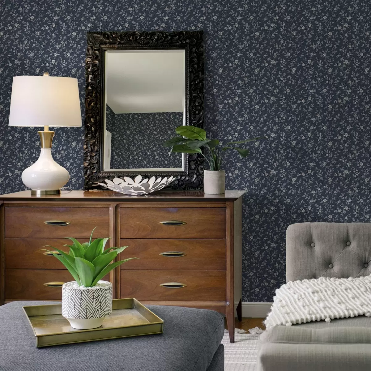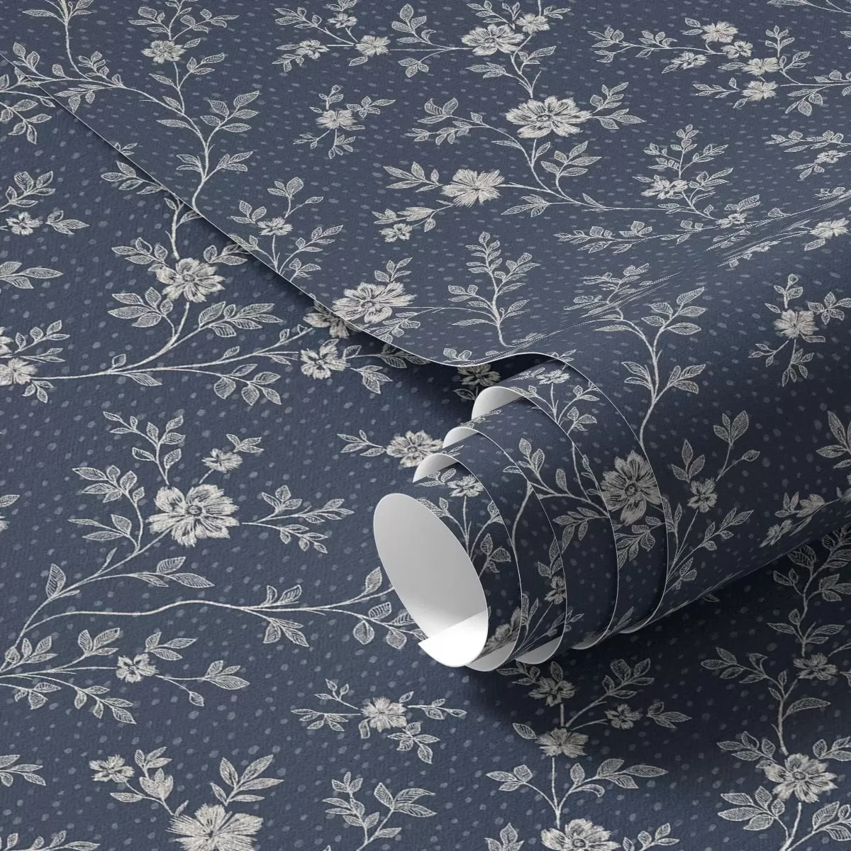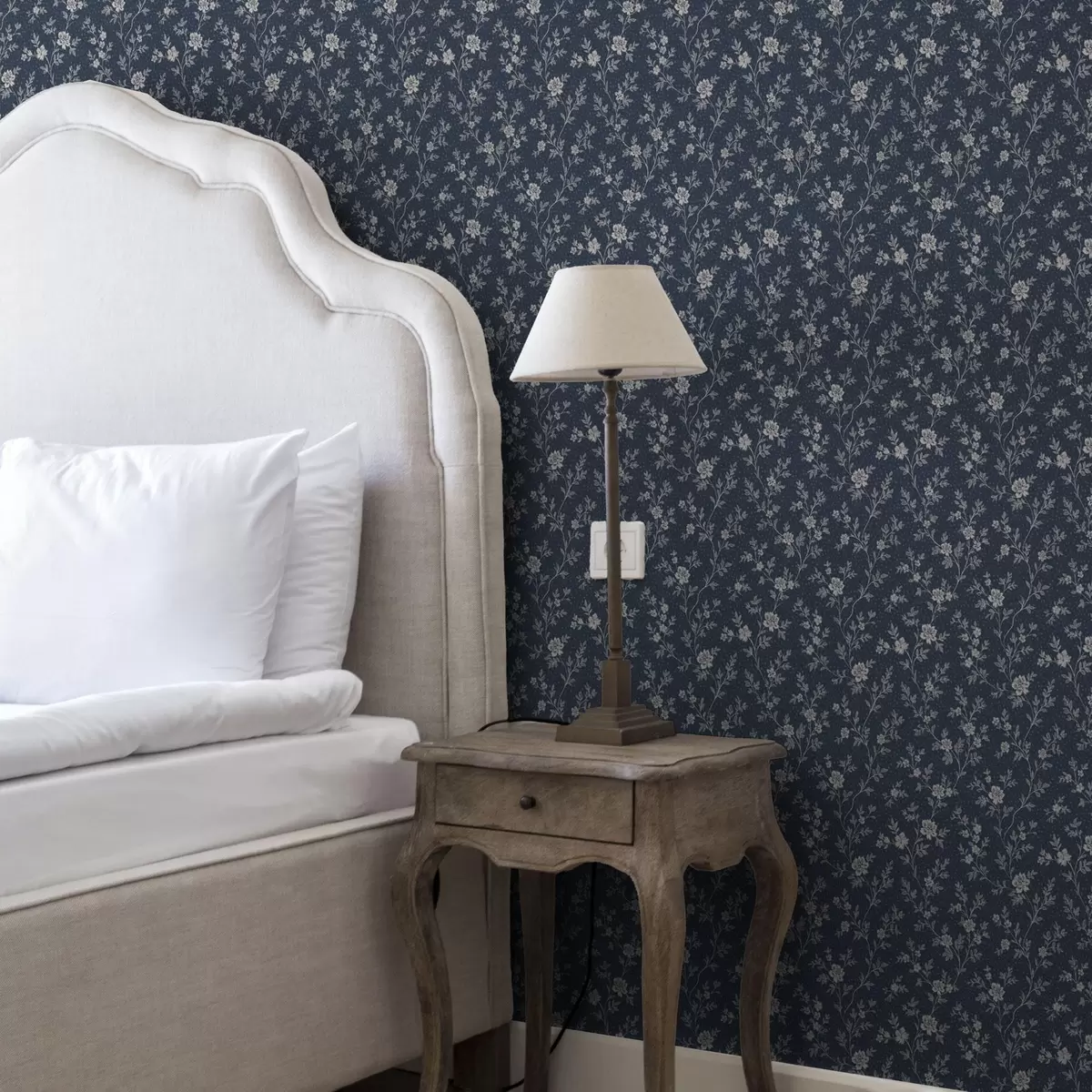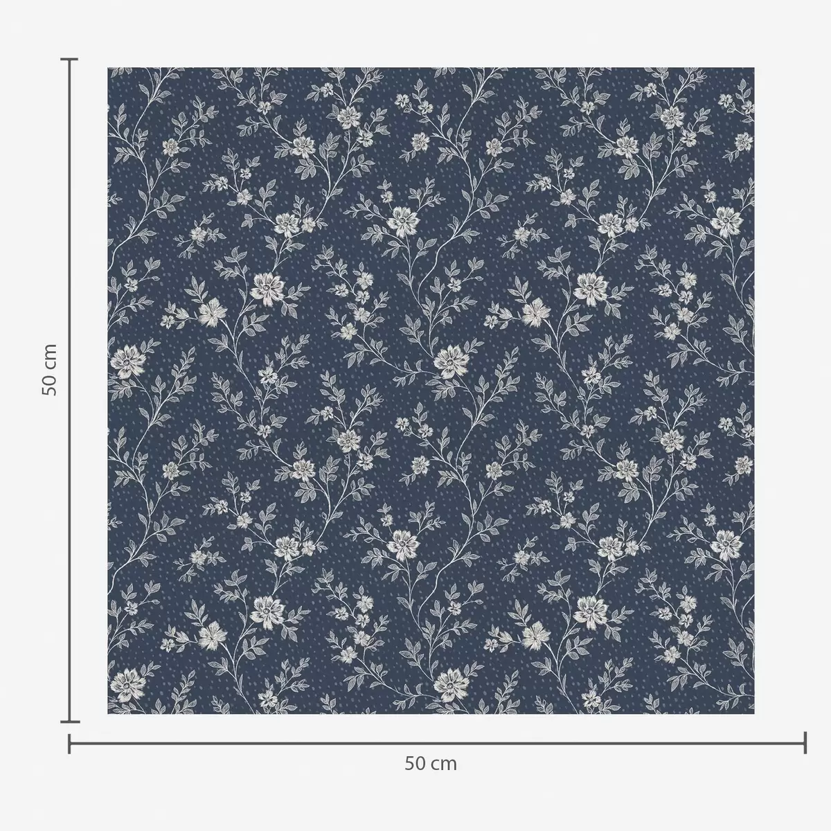 Шпалери Темно-синій фон з тонкими бежевими гілками та квітами Nr. a00612
