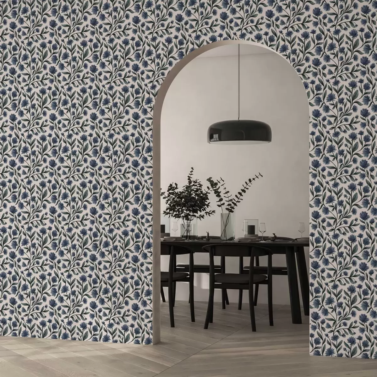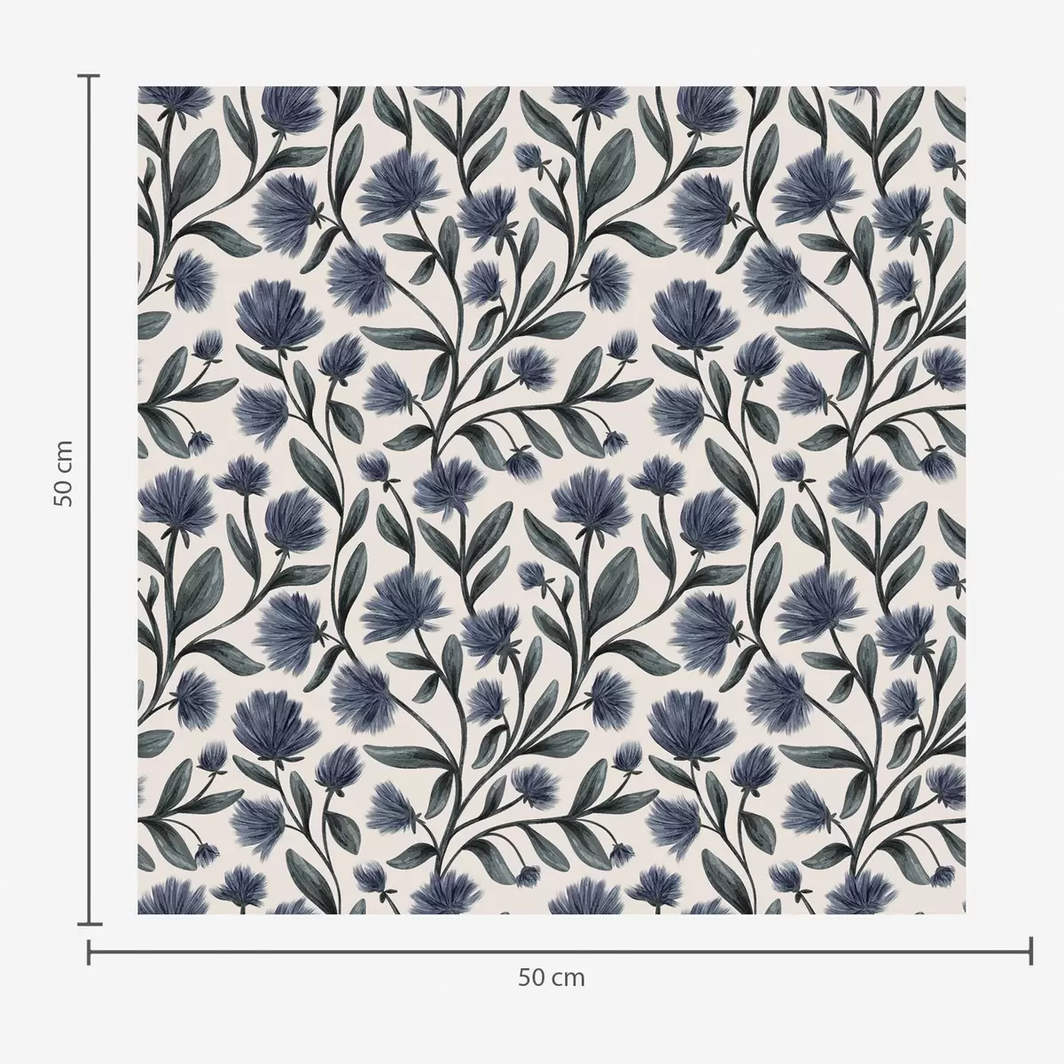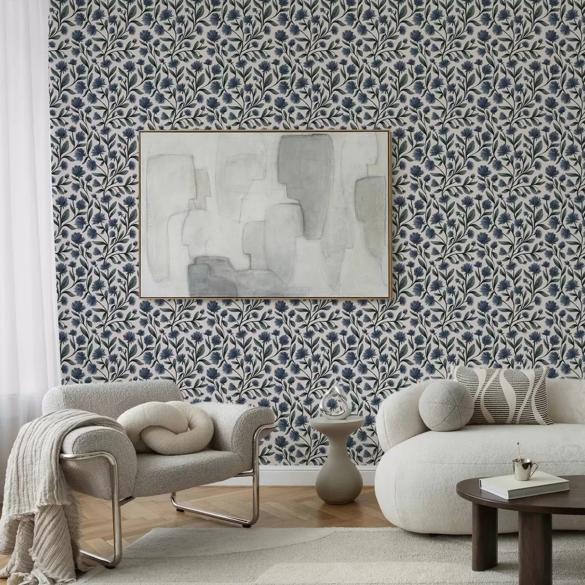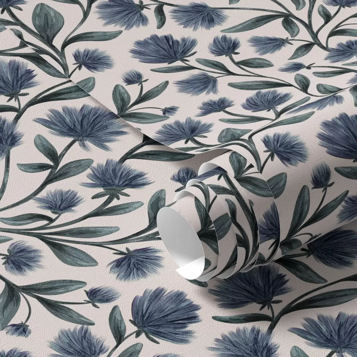 Шпалери Польові квіти в синьо-зеленій гамі на кремовому тлі Nr. a00623v2