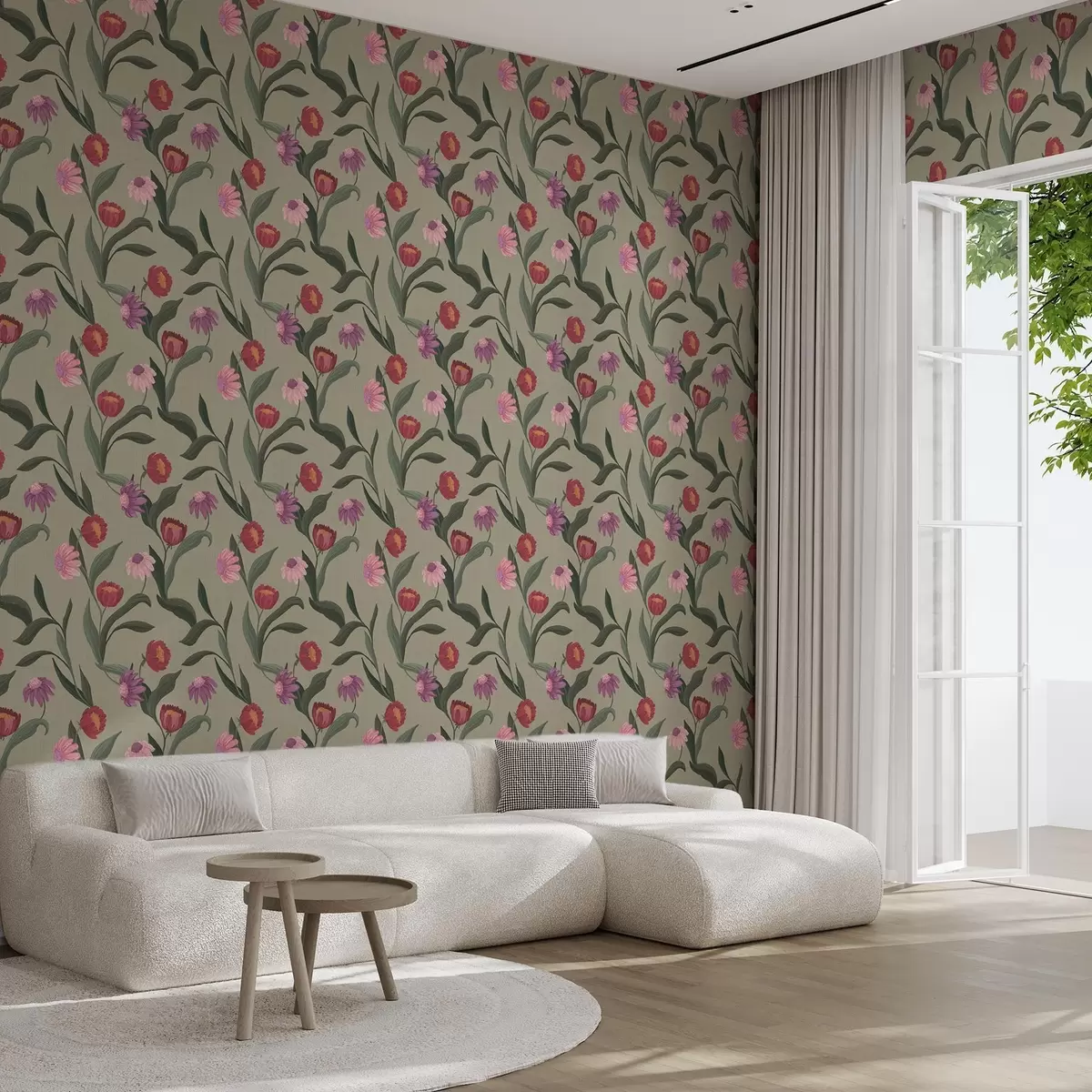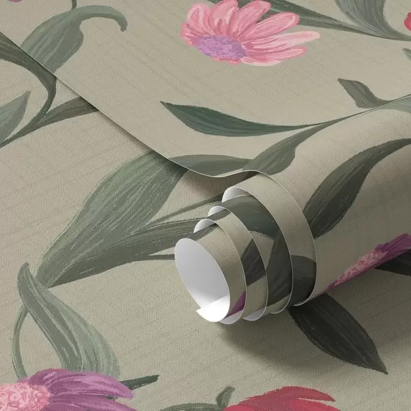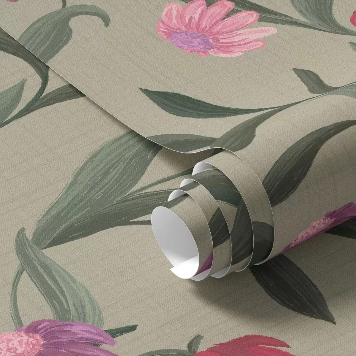 Шпалери Рожево-червоні квіти на оливковому тлі, текстура полотна Nr. a00631v1
