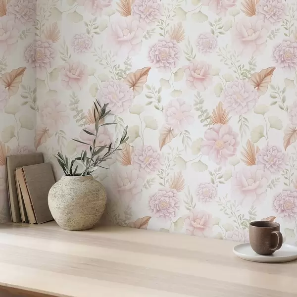 Шпалери М'які пастельні півонії та листя на білому тлі Nr. a00669