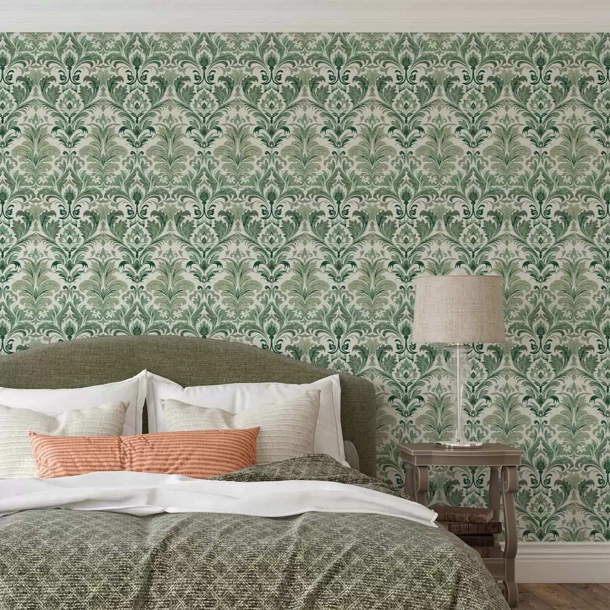 Шпалери Зелений дамаск з рельєфною текстурою на світлому тлі a00692