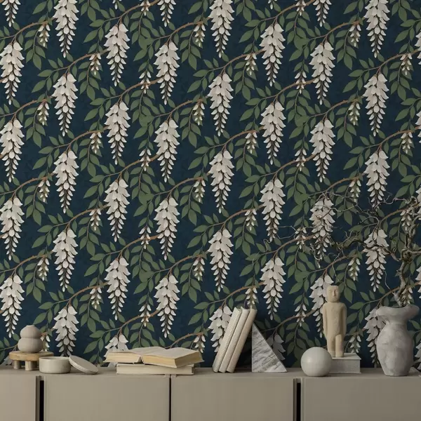 Шпалери Слонова кістка гліцинія на глибокому синьо-зеленому тлі Nr. a00694v1
