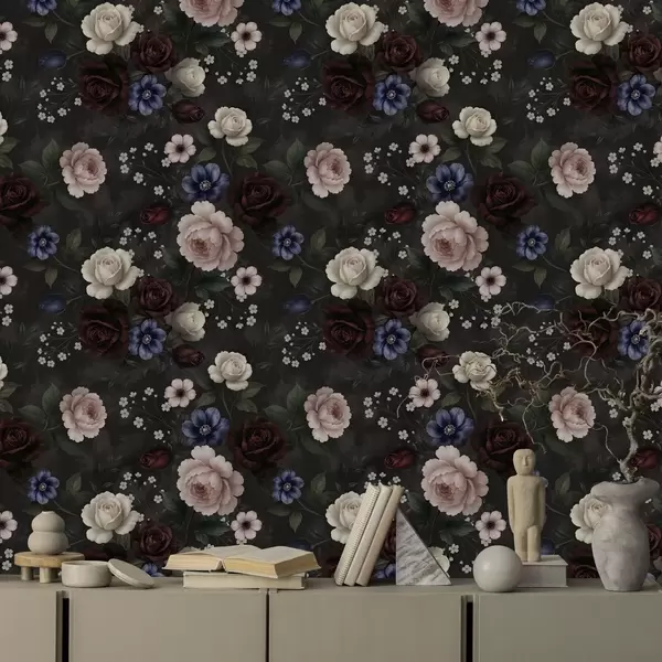 Шпалери Темні троянди, анемони та півонії на глибокому тлі a00704