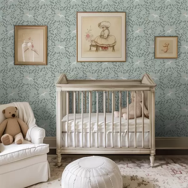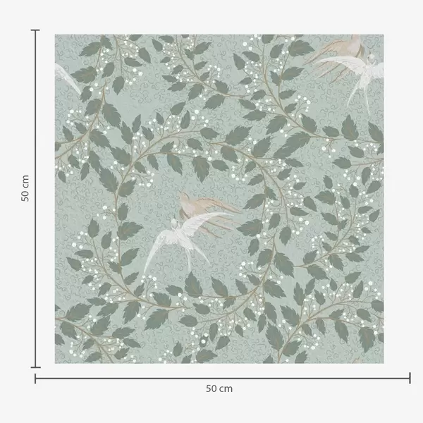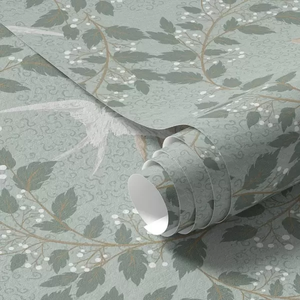 Шпалери Гілки з білими ягодами і птахами на зеленому тлі Nr. a00731