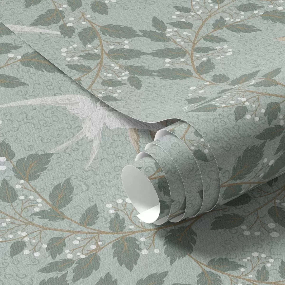 Шпалери Гілки з білими ягодами і птахами на зеленому тлі a00731