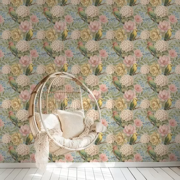 Шпалери Папуги серед півоній, гортензій та магнолій a00747