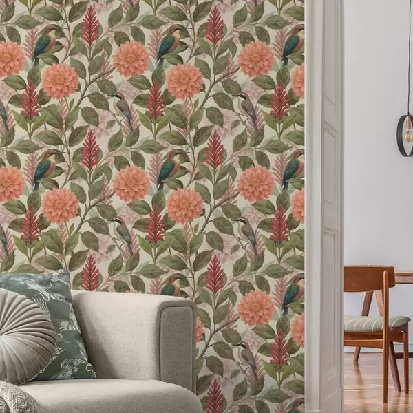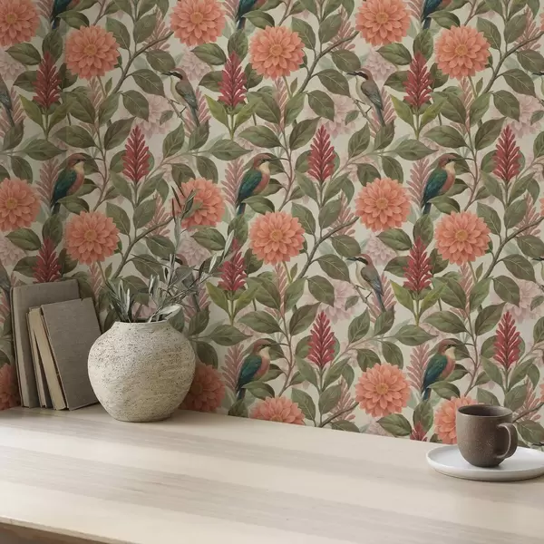 Шпалери Птахи серед квітів і листя в теплих тонах Nr. a00753