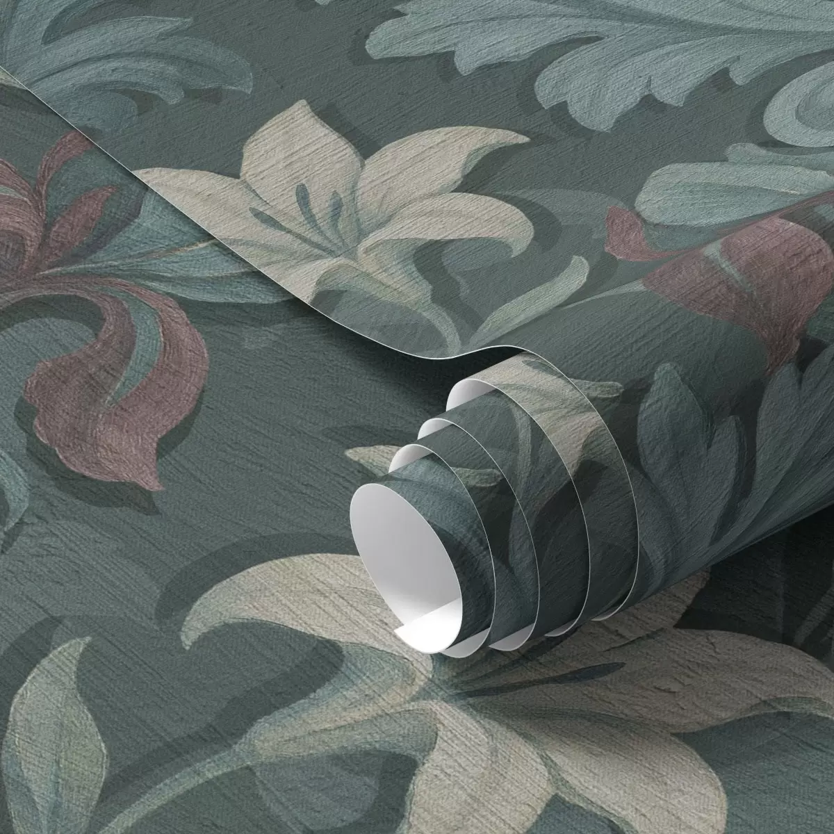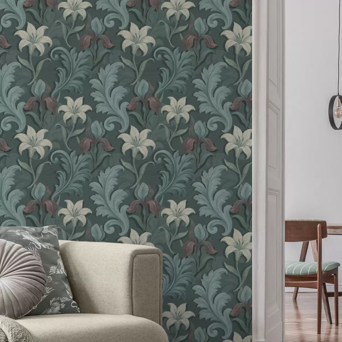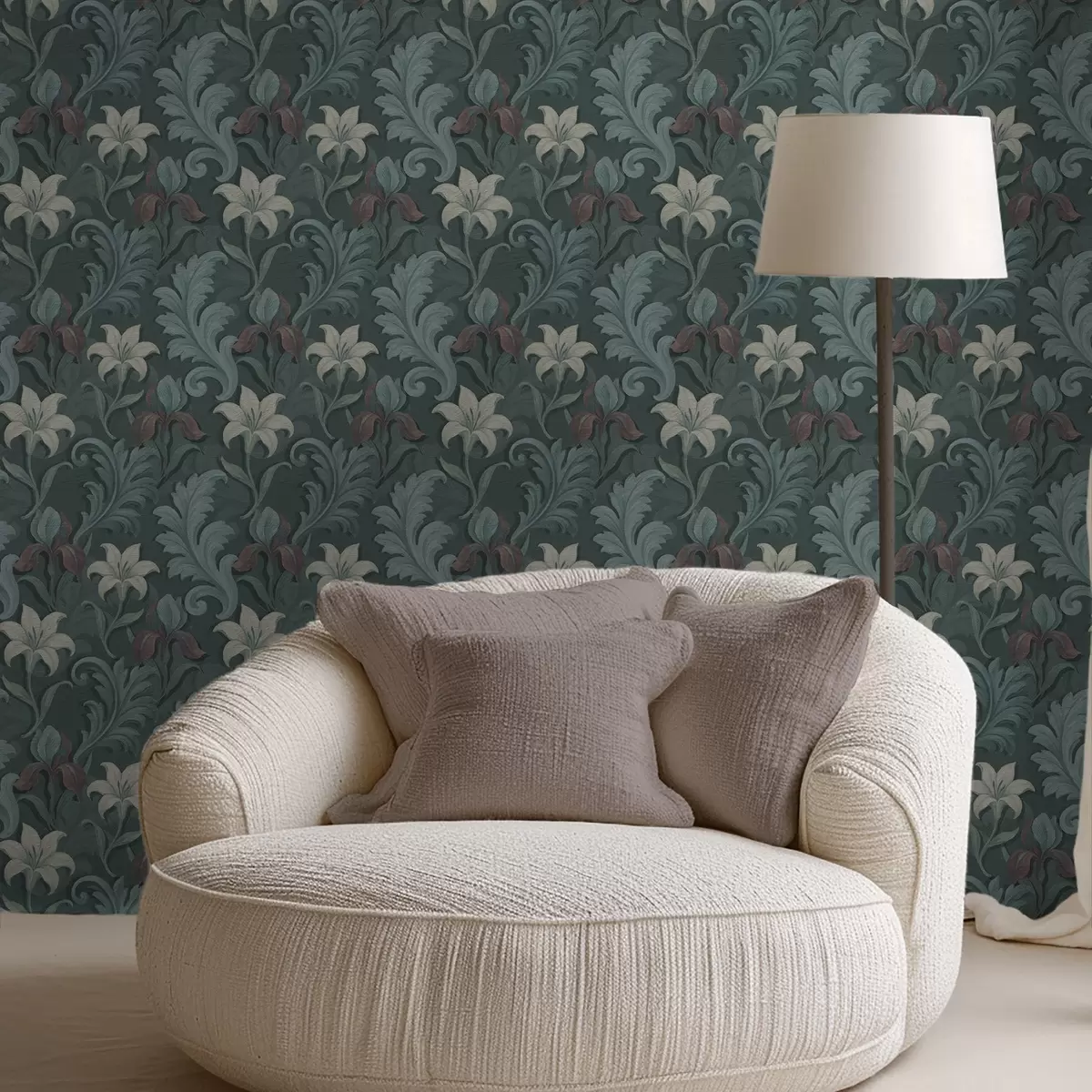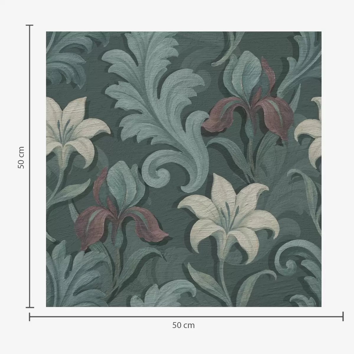 Шпалери Темно-зелений фон з ірисами та декоративним листям Nr. a00755