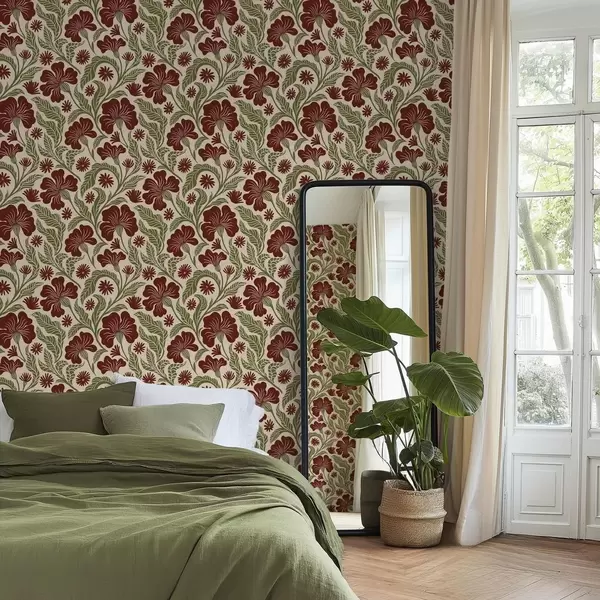 Шпалери Бургундські квіти з зеленим листям на світлому тлі Nr. a00761