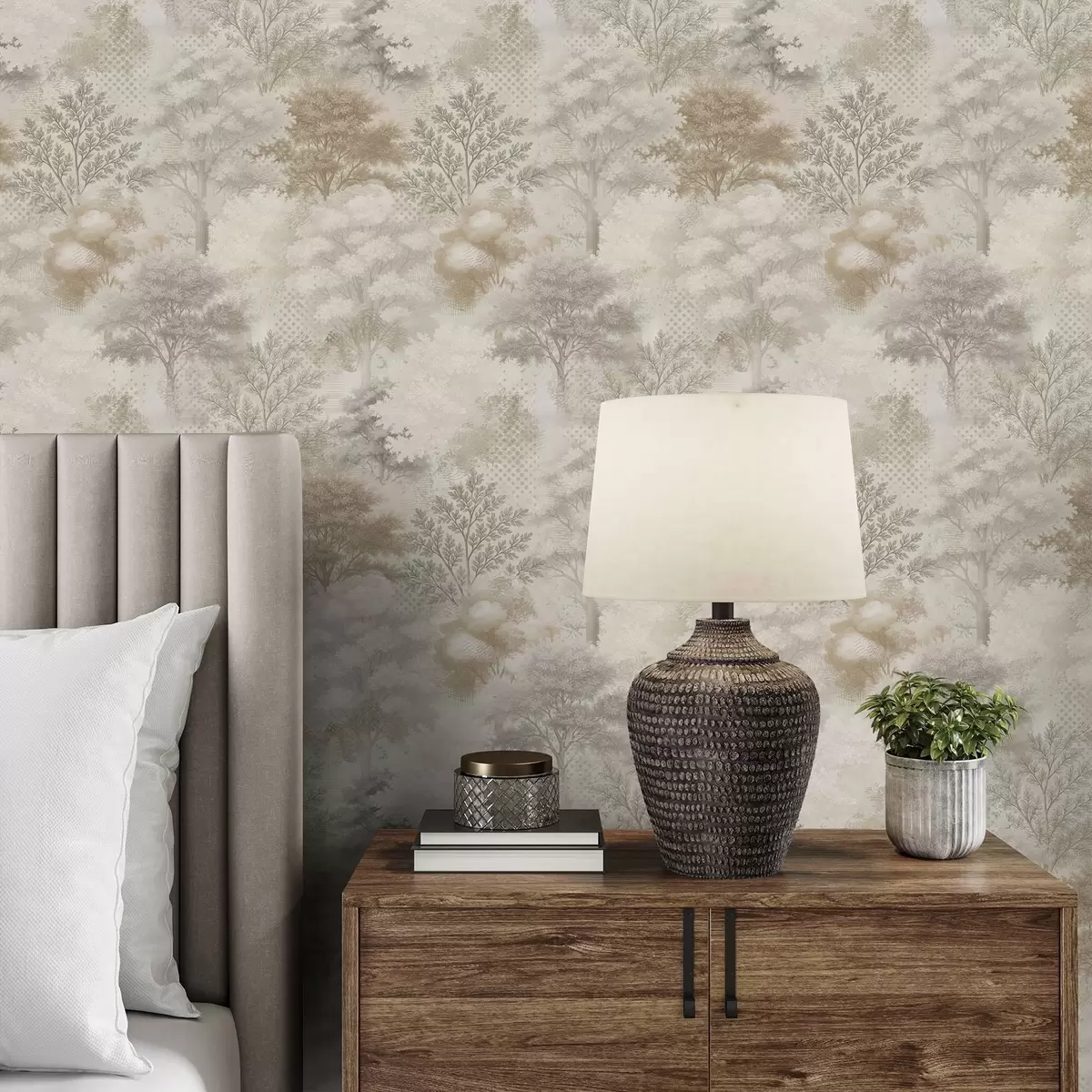 Шпалери Ніжний ліс у тумані, м'які бежево-сірі тони a00785