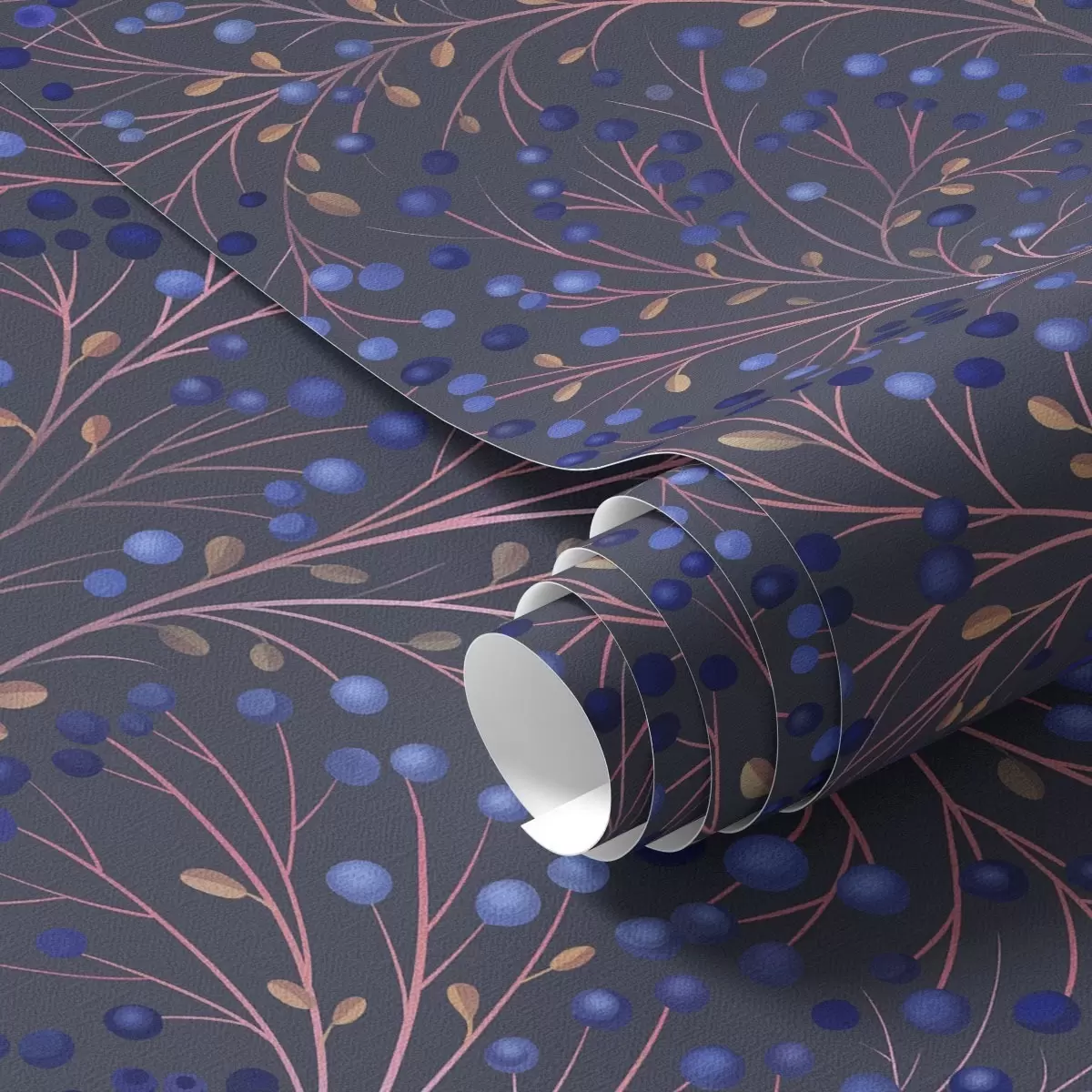 Шпалери Рожево-коричневі гілки та сині ягоди на графітовому тлі a00787