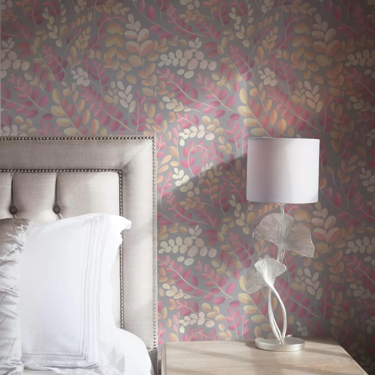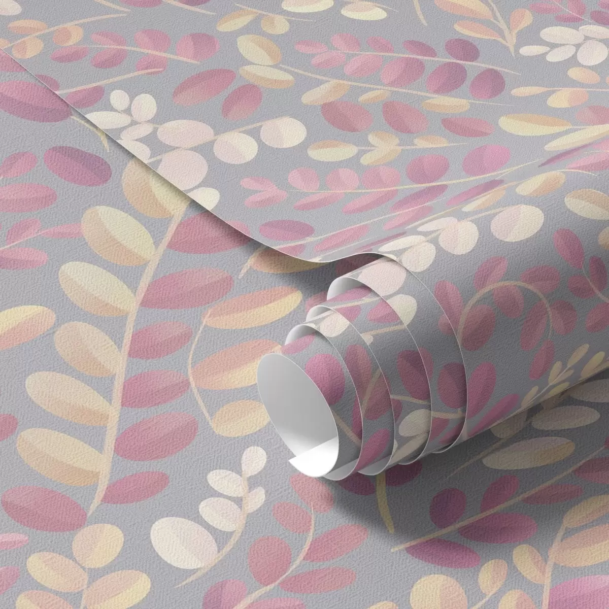 Шпалери Пастельні гілки з рожево-персиковим листям на сірому тлі Nr. a00799v1