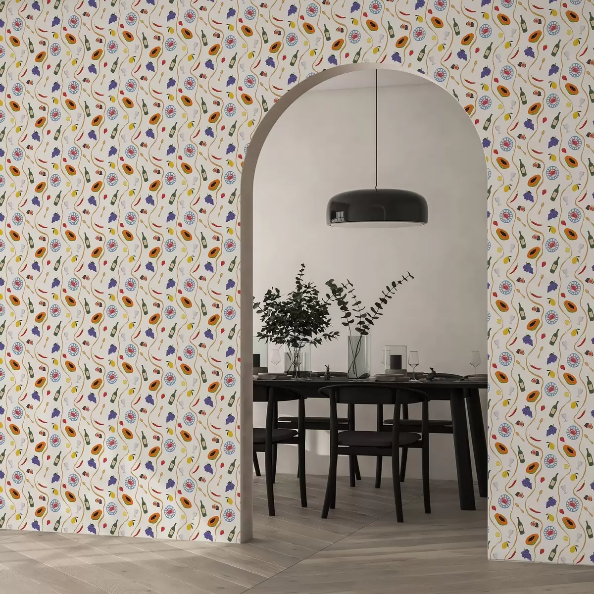 Шпалери Пляшки, папая, лимони та спеції на світлому тлі Nr. a00802