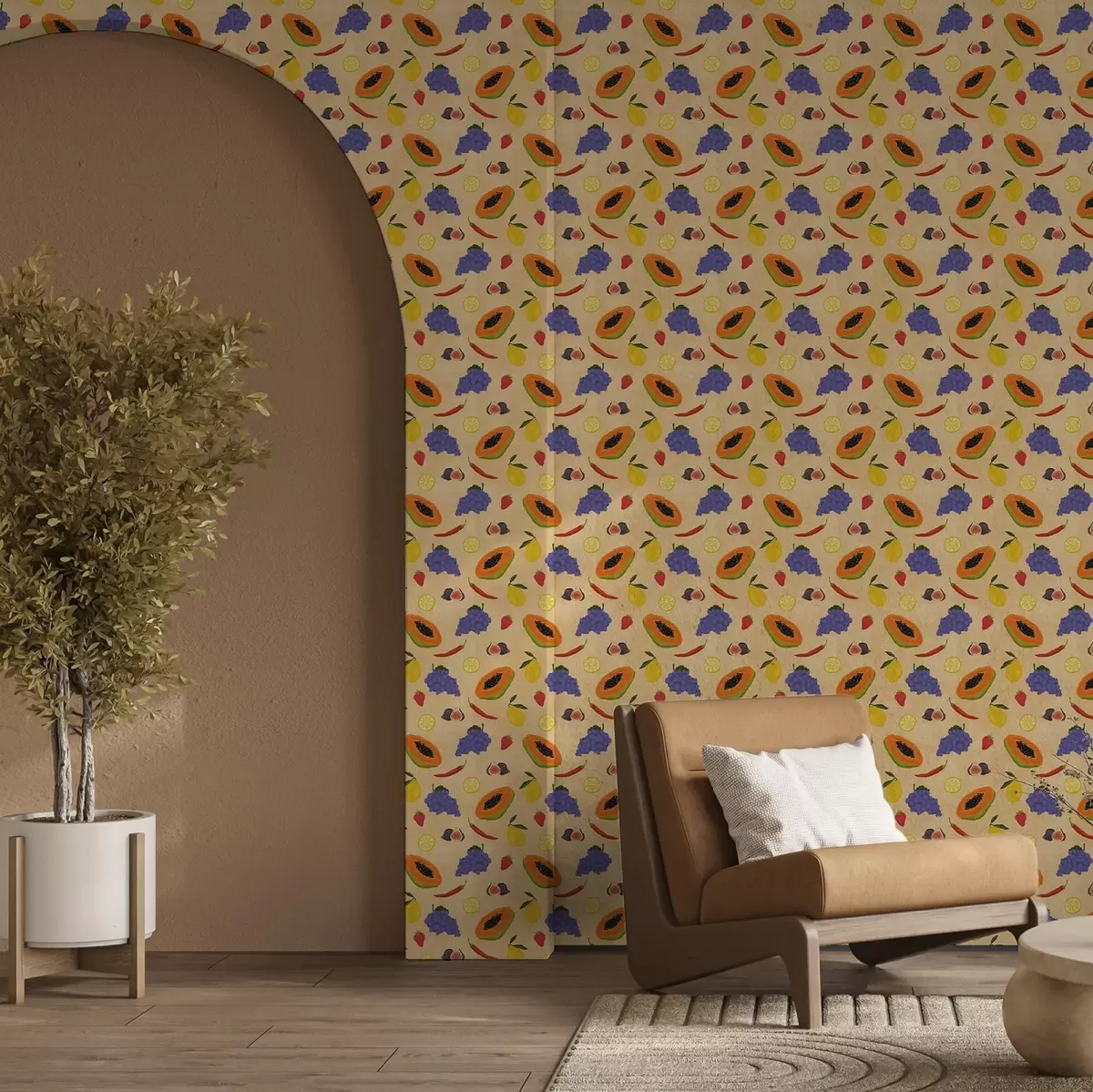 Шпалери Папая, цитрусові та ягоди на насиченому теплому тлі Nr. a00803v1