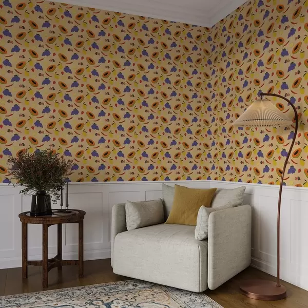 Шпалери Папая, цитрусові та ягоди на насиченому теплому тлі Nr. a00803v1