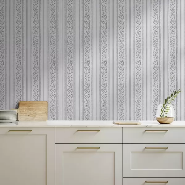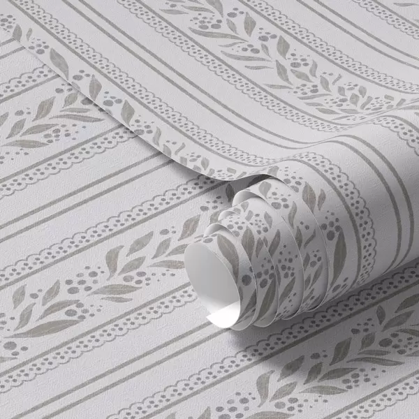 Шпалери Смужки з мереживом і гілочками на прохолодному білому тлі a00814v1